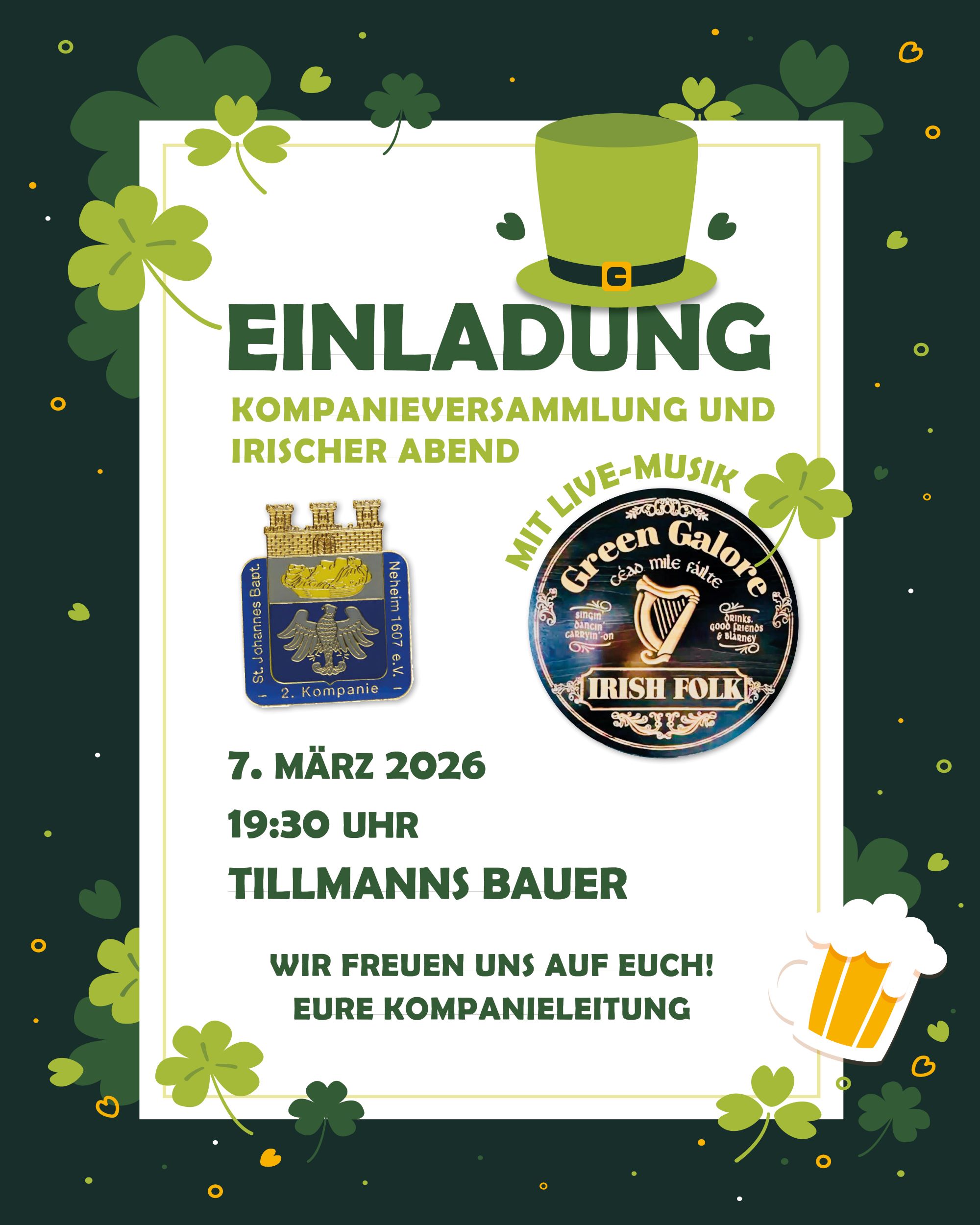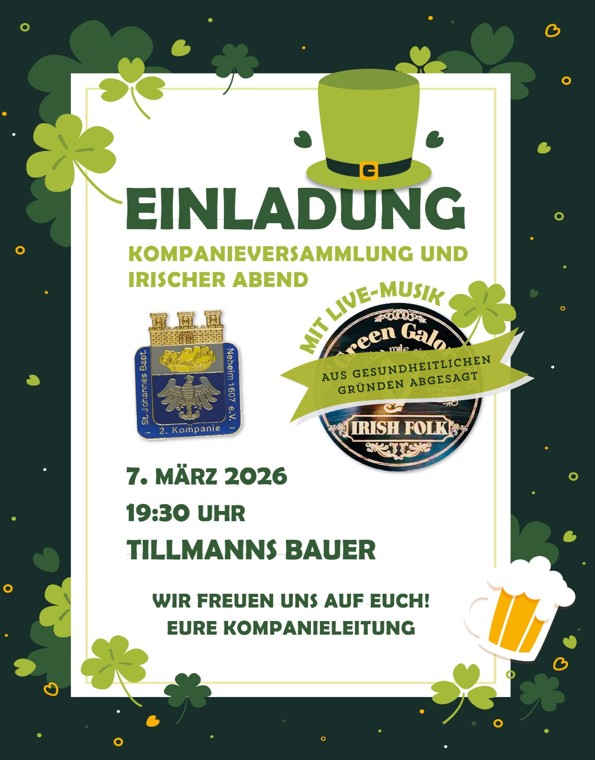 Wir freuen uns darauf euch am 07.03.2026 zu unserer Kompanieversammlung im Tillmanns Bauer begrüßen zu dürfen. Der Abend steht ganz unter dem Motto Irischer Abend.